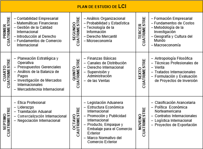 Formar profesionistas especializados en el comercio exterior, que conozcan las normas y reglamentos internacionales para que puedan ser capaces de aplicar sus conocimientos en el diseñ0 de proyectos y estrategias de negociación que den respuesta a las necesidades de demandan los organismos nacionales e internacionales como parte de su crecimiento y desarrollo.